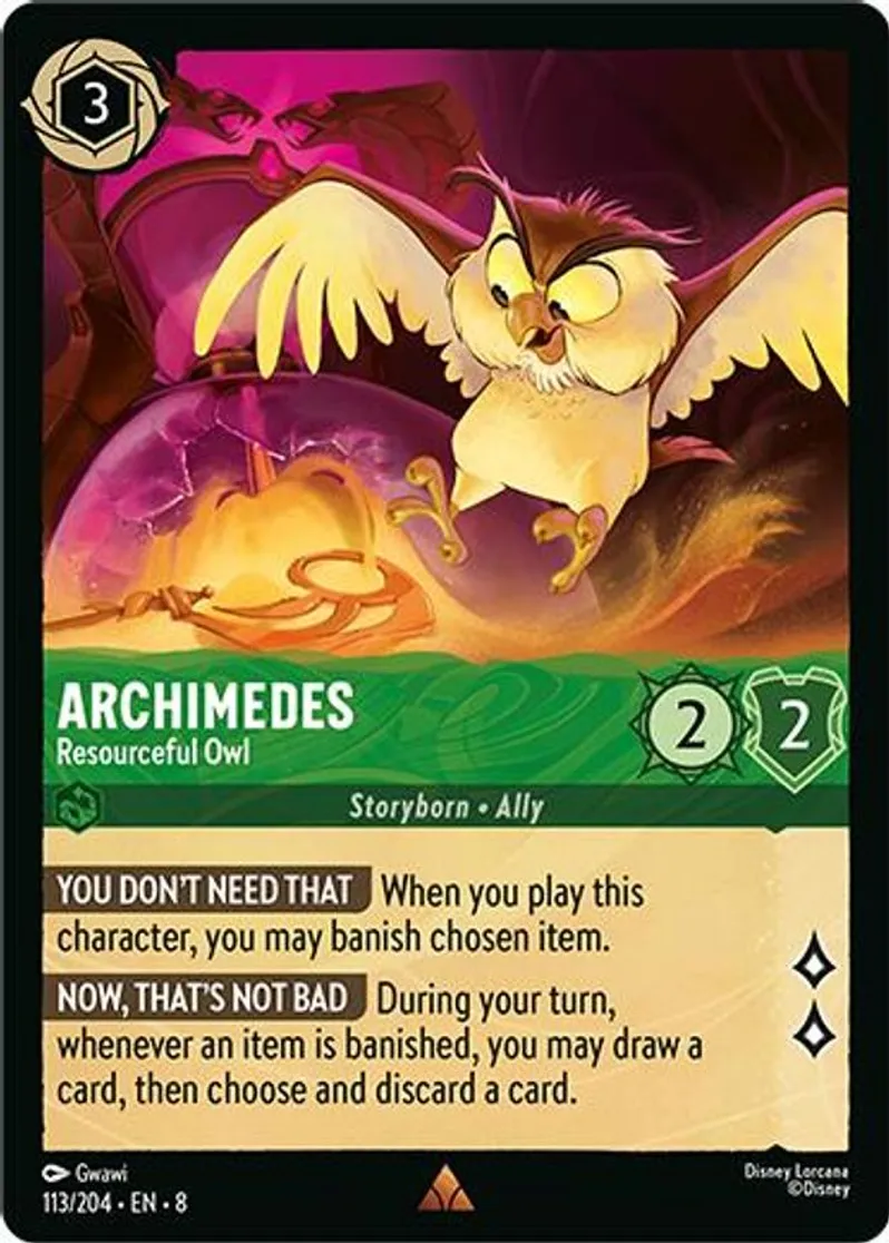 | Oracle Text | [You Don't Need That] When you play this character, you may banish chosen item. [Know, That's Not Bad] During your turn, whenever an item is banished, you may draw a card, then choose and discard a card. | ||