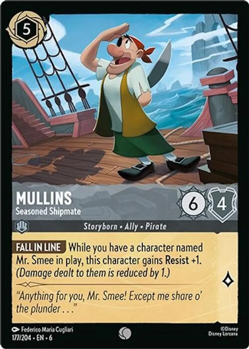 | Oracle Text | [Fall in Line] While you have a character named Mr. Smee in play, this character gets Resist +1. (Damage dealt to them is reduced by 1.) | ||