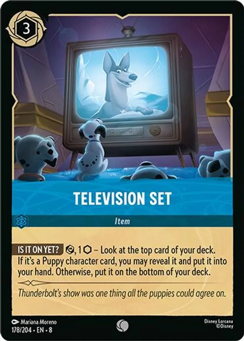 | Oracle Text | [Is It On Yet?] Exert, 1 Ink – Look at the top card of your deck. If it's a Puppy character card, you may reveal it and put it into your hand. Otherwise, put it on the bottom of your deck. | ||