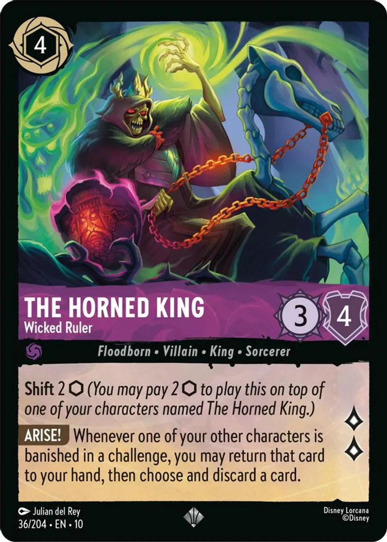 | Oracle Text | Shift 2 Ink (You may pay 2 Ink to play this on top of one of your characters named The Horned King.) [Arise!] Whenever one of your other characters is banished in challenge, you may return that card to your hand, then choose and discard a card. | ||