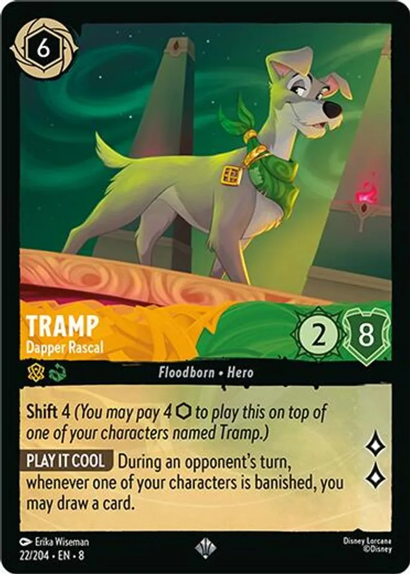 | Oracle Text | Shift 4 (You may pay 4 Ink to play this on top of one of your characters named Tramp.) [Play It Cool] During an opponent's turn, whenever one of your characters is banished, you may draw a card. | ||