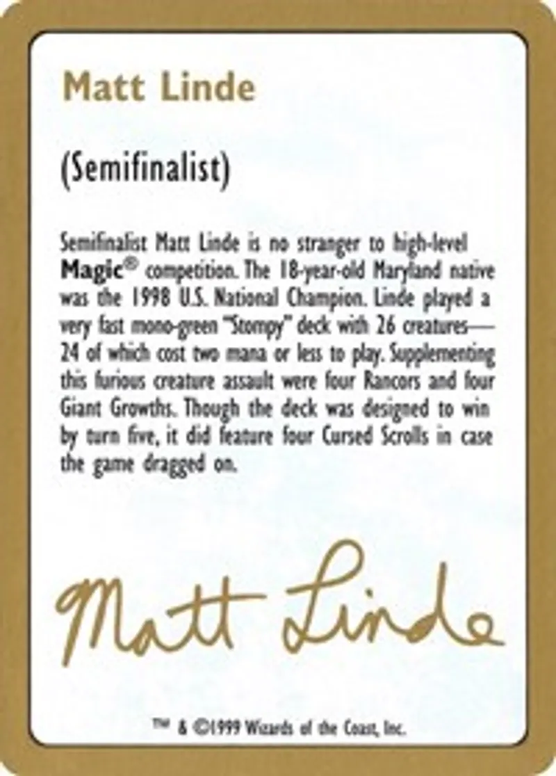 1999 Matt Linde Biography Card is a Token in the set World Championship Decks.