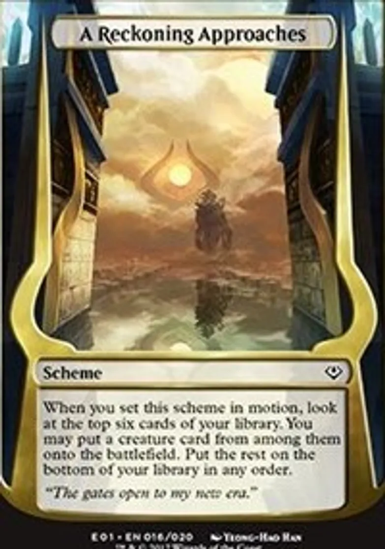 A Reckoning Approaches (Archenemy: Nicol Bolas) is a Common in the set Oversize Cards.