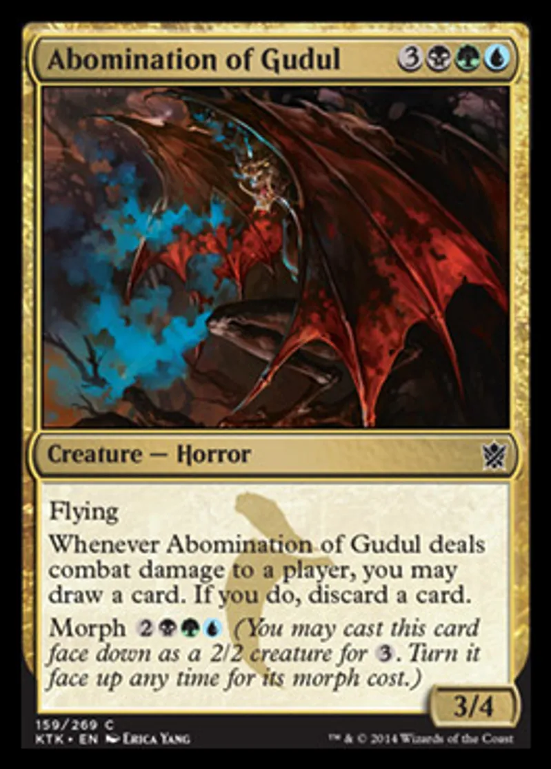 | Oracle Text | Flying Whenever Abomination of Gudul deals combat damage to a player, you may draw a card. If you do, discard a card. Morph {{2}}{{b}}{{g}}{{u}} (You may cast this card face down as a 2/2 creature for {{3}}. Turn it face up any time for its morph cost.) | ||