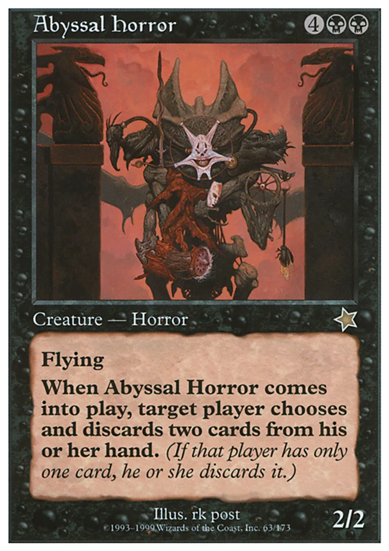 | Oracle Text | Flying When Abyssal Horror enters the battlefield, target player discards two cards. | ||