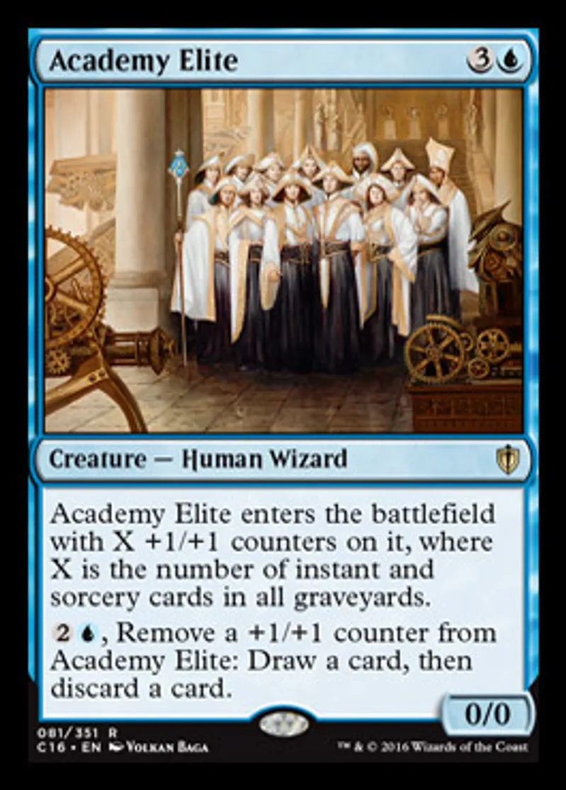 | Oracle Text | Academy Elite enters the battlefield with X +1/+1 counters on it, where X is the number of instant and sorcery cards in all graveyards. {{2}}{{u}}, Remove a +1/+1 counter from Academy Elite: Draw a card, then discard a card. | ||