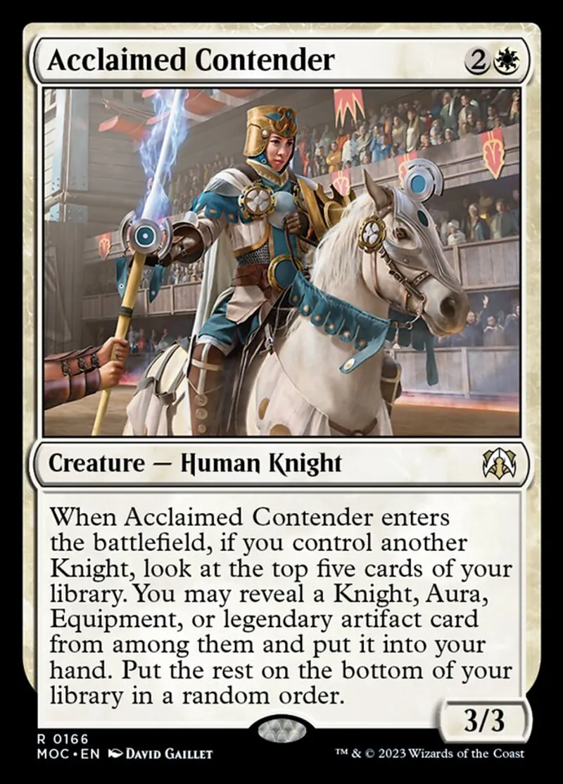 | Oracle Text | When Acclaimed Contender enters the battlefield, if you control another Knight, look at the top five cards of your library. You may reveal a Knight, Aura, Equipment, or legendary artifact card from among them and put it into your hand. Put the rest on the bottom of your library in a random order. | ||