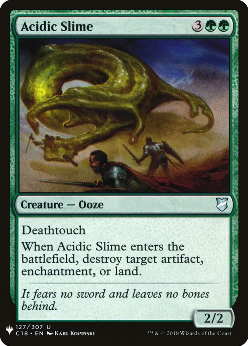 When Acidic Slime enters the battlefield, destroy target artifact, enchantment, or land. | ||