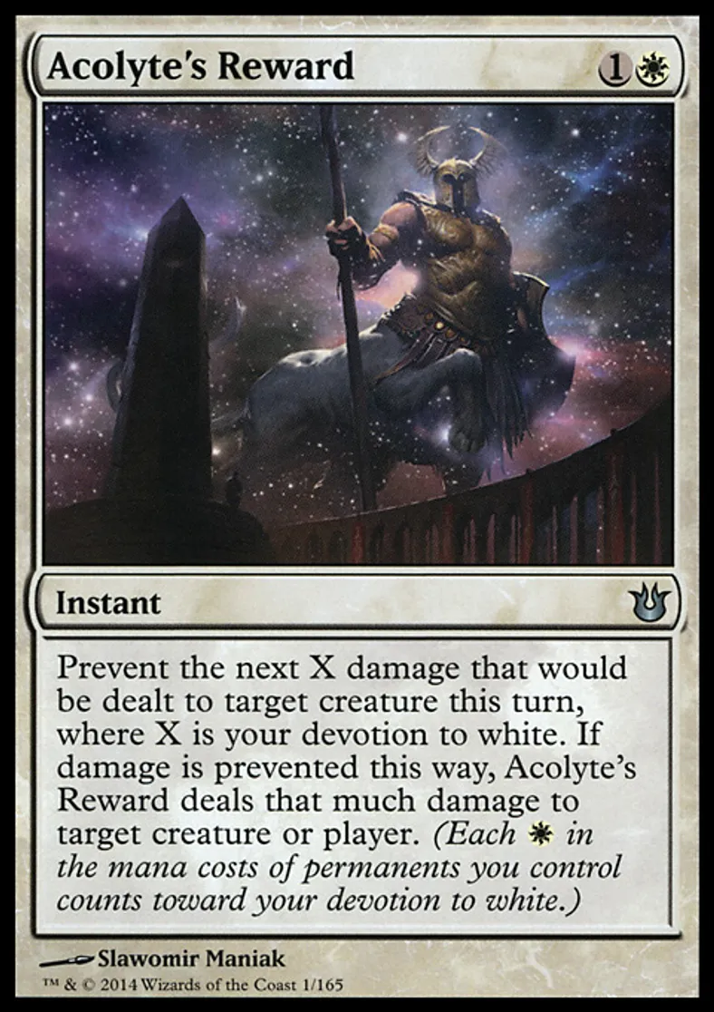 | Oracle Text | Prevent the next X damage that would be dealt to target creature this turn, where X is your devotion to white. If damage is prevented this way, Acolyte's Reward deals that much damage to target creature or player. (Each {{w}} in the mana costs of permanents you control counts toward your devotion to white.) | ||