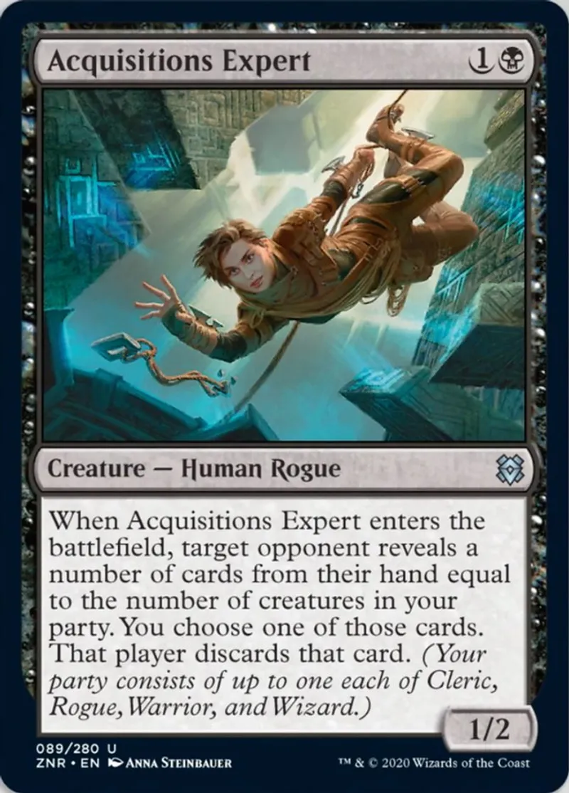 | Oracle Text | When Acquisitions Expert enters the battlefield, target opponent reveals a number of cards from their hand equal to the number of creatures in your party. You choose one of those cards. That player discards that card. (Your party consists of up to one each of Cleric, Rogue, Warrior, and Wizard.) | ||