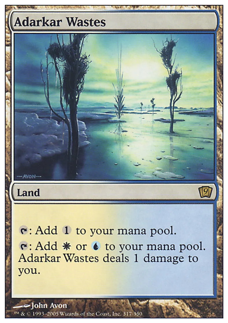 | Oracle Text | {{t}}: Add {{1}} to your mana pool. {{t}}: Add {{w}} or {{u}} to your mana pool. Adarkar Wastes deals 1 damage to you. | ||