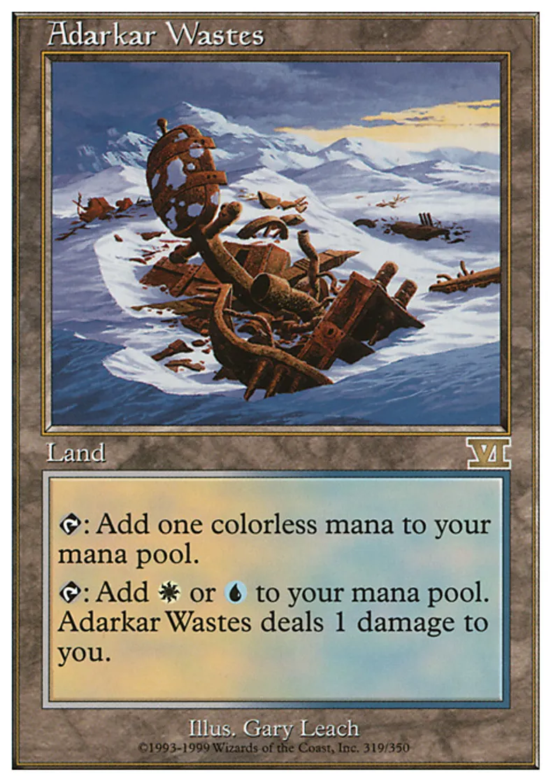 | Oracle Text | {{t}}: Add {{1}} to your mana pool. {{t}}: Add {{w}} or {{u}} to your mana pool. Adarkar Wastes deals 1 damage to you. | ||