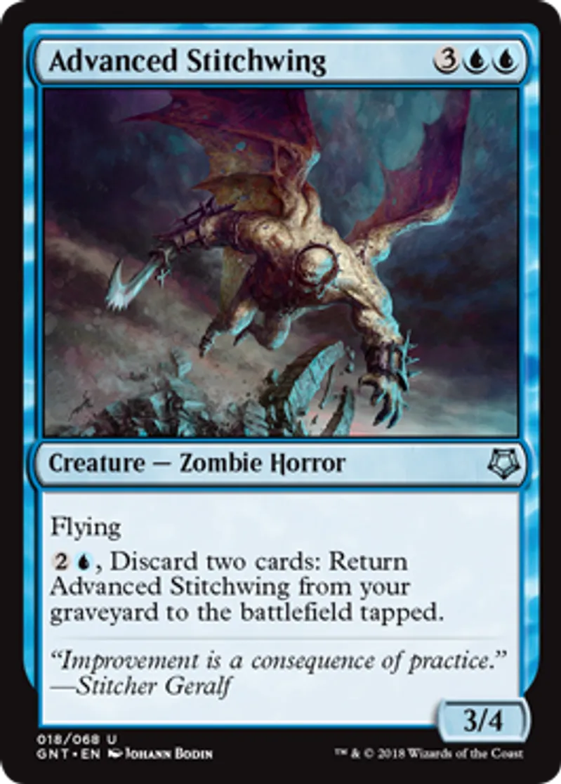 | Oracle Text | Flying {{2}}{{u}}, Discard two cards: Return Advanced Stitchwing from your graveyard to the battlefield tapped. | ||