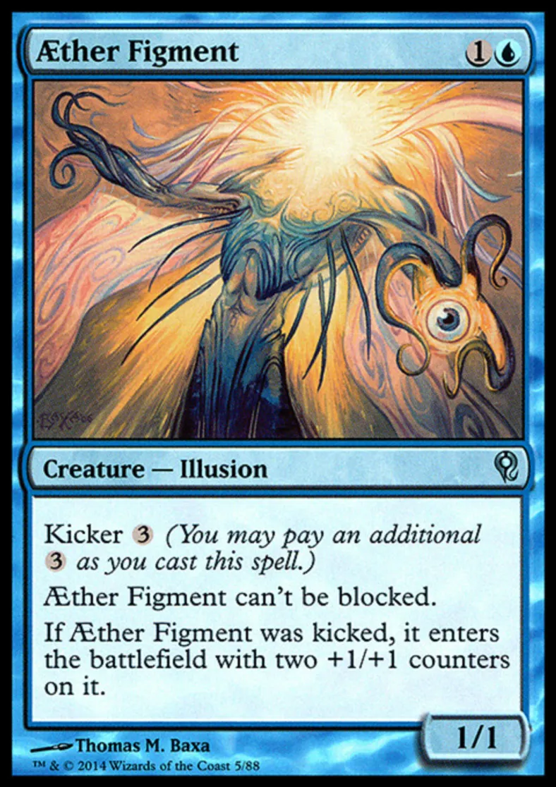 | Oracle Text | Kicker {{3}} (You may pay an additional {{3}} as you cast this spell.) Æther Figment can't be blocked. If Æther Figment was kicked, it enters the battlefield with two +1/+1 counters on it. | ||