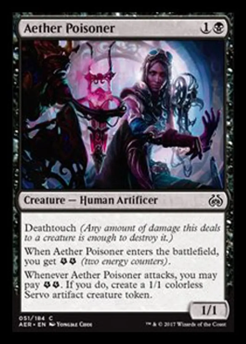 | Oracle Text | Deathtouch (Any amount of damage this deals to a creature is enough to destroy it.) When Aether Poisoner enters the battlefield, you get {{Energy}}{{Energy}} (two energy counters). Whenever Aether Poisoner attacks, you may pay {{Energy}}{{Energy}}. If you do, create a 1/1 colorless Servo artifact creature token. | ||