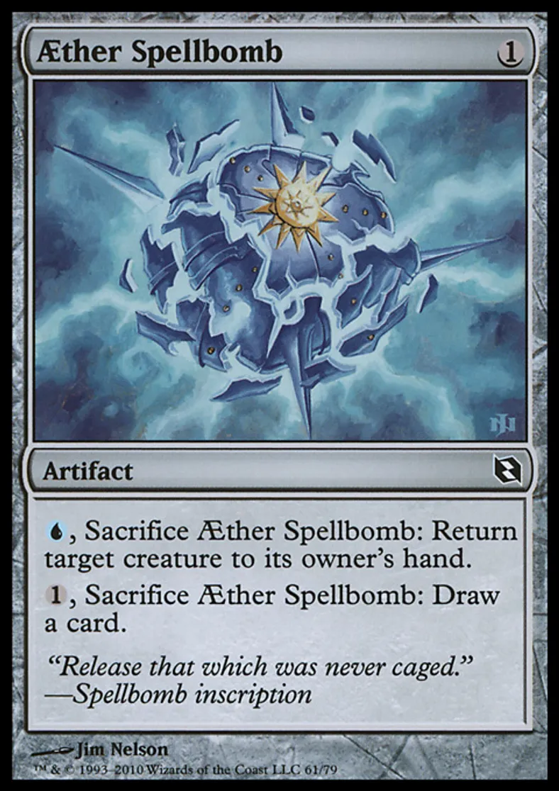 | Oracle Text | {{u}}, Sacrifice Æther Spellbomb: Return target creature to its owner's hand. {{1}}, Sacrifice Æther Spellbomb: Draw a card. | ||