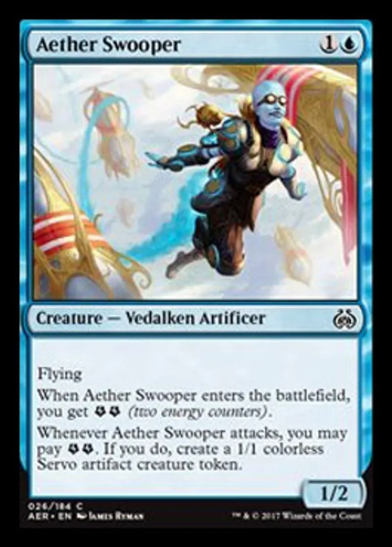 | Oracle Text | Flying When Aether Swooper enters the battlefield, you get {{Energy}}{{Energy}} (two energy counters). Whenever Aether Swooper attacks, you may pay {{Energy}}{{Energy}}. If you do, create a 1/1 colorless Servo artifact creature token. | ||