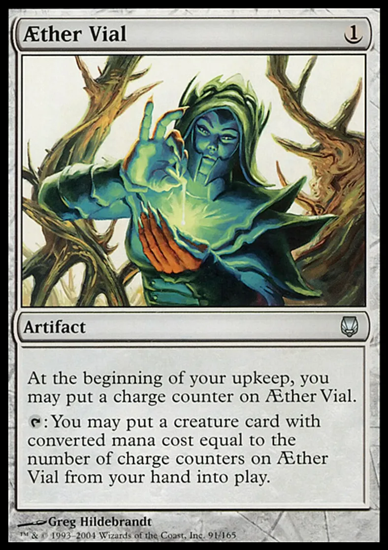| Oracle Text | At the beginning of your upkeep, you may put a charge counter on Æther Vial. {{t}}: You may put a creature card with converted mana cost equal to the number of charge counters on Æther Vial from your hand onto the battlefield. | ||