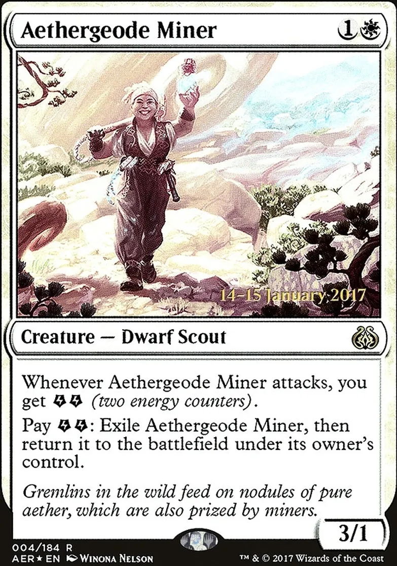 | Oracle Text | Whenever Aethergeode Miner attacks, you get {{e}} {{e}} (two energy counters). Pay {{e}} {{e}}: Exile Aethergeode Miner, then return it to the battlefield under its owner's control. | ||