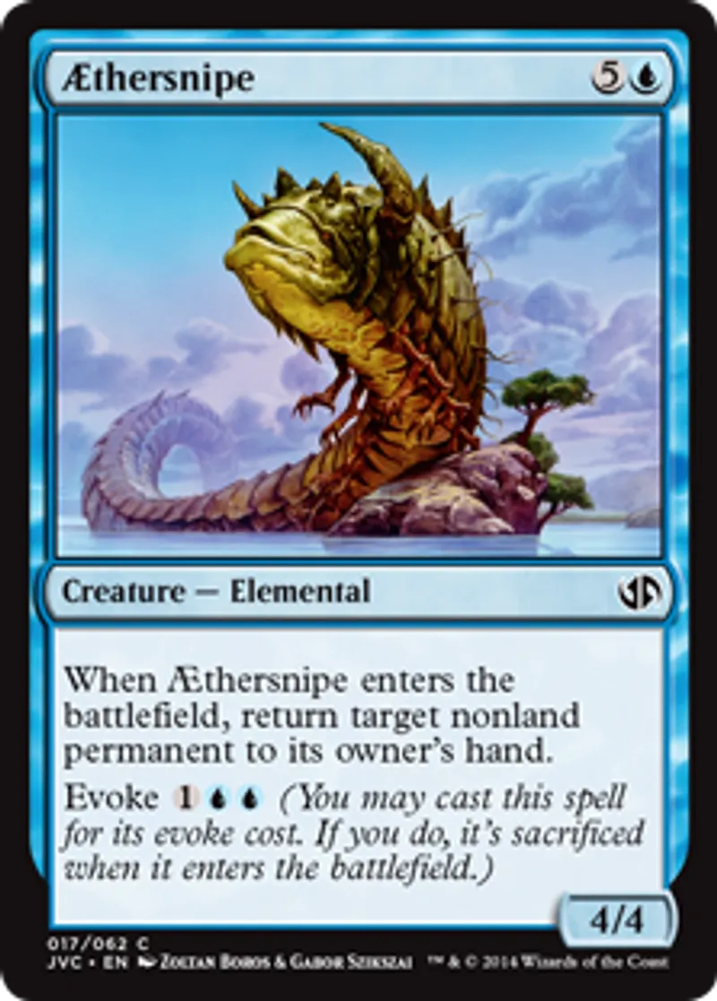 | Oracle Text | When Aethersnipe enters the battlefield, return target nonland permanent to its owner's hand. Evoke {{1}}{{u}}{{u}} (You may cast this spell for its evoke cost. If you do, it's sacrificed when it enters the battlefield.) | ||