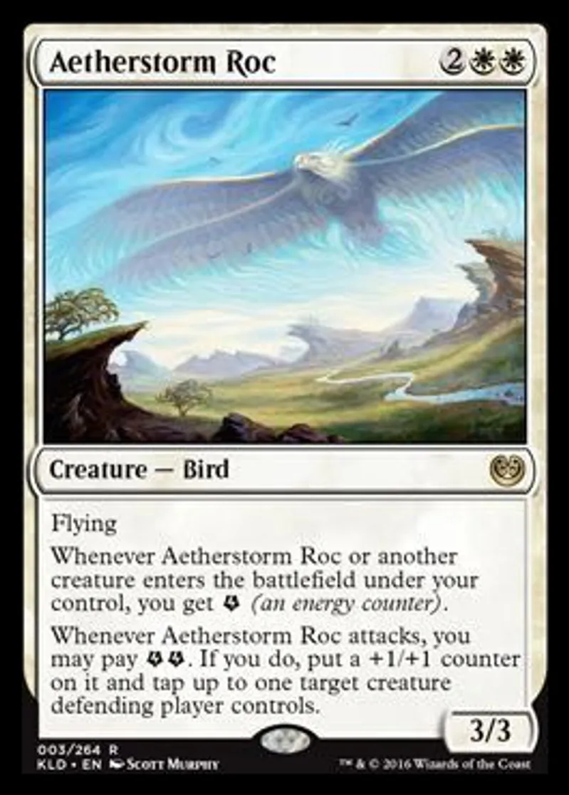 | Oracle Text | Flying Whenever Aetherstorm Roc or another creature enters the battlefield under your control, you get {{Energy}} (an energy counter). Whenever Aetherstorm Roc attacks, you may pay {{Energy}}{{Energy}}. If you do, put a +1/+1 counter on it and tap up to one target creature defending player controls. | ||