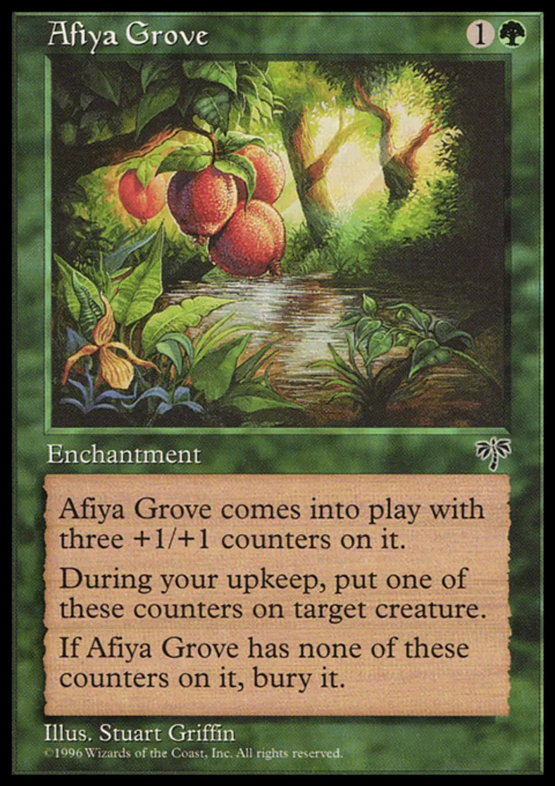 | Oracle Text | Afiya Grove enters the battlefield with three +1/+1 counters on it. At the beginning of your upkeep, move a +1/+1 counter from Afiya Grove onto target creature. When Afiya Grove has no +1/+1 counters on it, sacrifice it. | ||