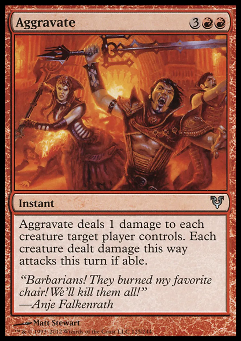 | Oracle Text | Aggravate deals 1 damage to each creature target player controls. Each creature dealt damage this way attacks this turn if able. | ||