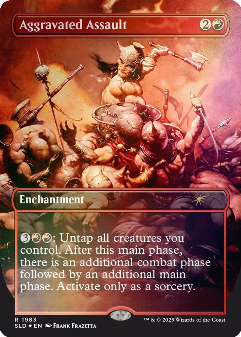 Magic: the Gathering (mtg) Rare enchantment Aggravated Assault from Secret Lair Drop Series (SLD) last updated 2026-02-25 15:22:32