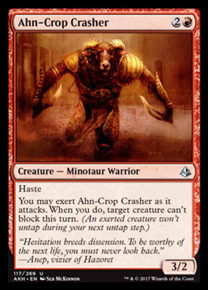 | Oracle Text | Haste You may exert Ahn-Crop Crasher as it attacks. When you do, target creature can't block this turn. (An exerted creature won't untap during your next untap step.) | ||