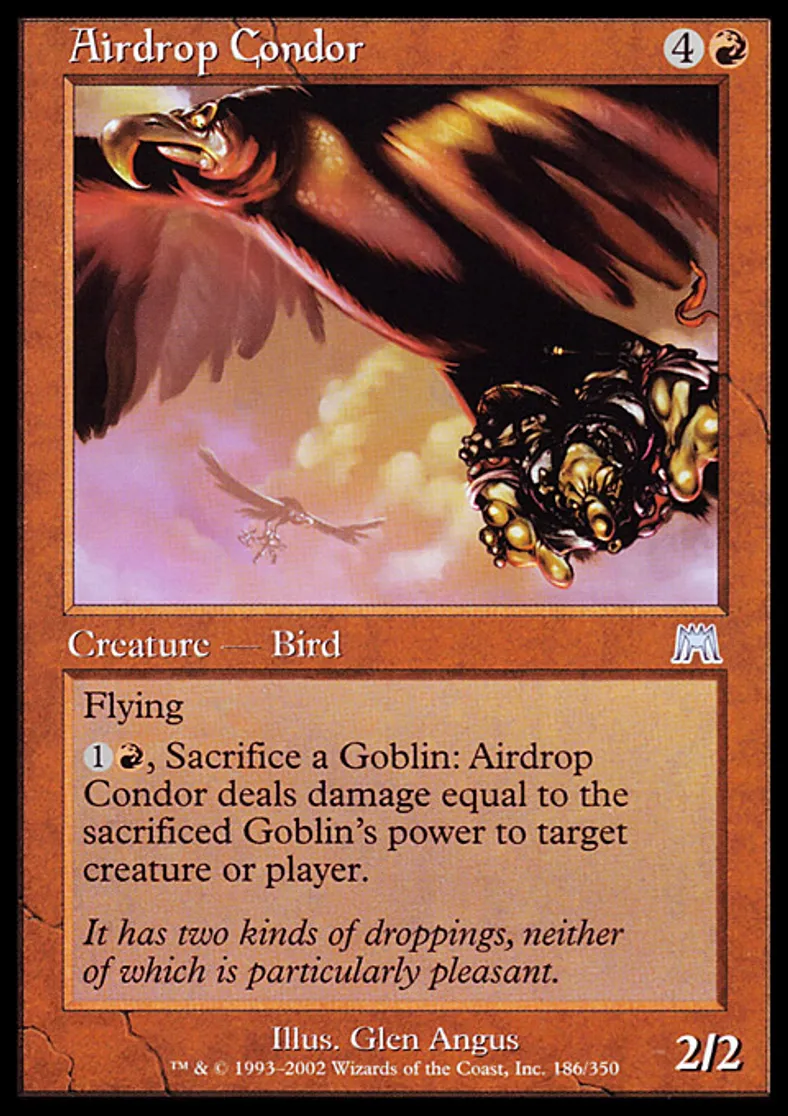 | Oracle Text | Flying {{1}}{{r}}, Sacrifice a Goblin creature: Airdrop Condor deals damage equal to the sacrificed creature's power to target creature or player. | ||
