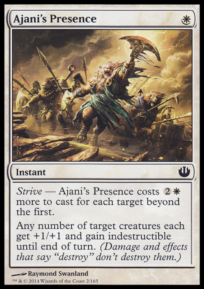 | Oracle Text | Strive — Ajani's Presence costs {{2}}{{w}} more to cast for each target beyond the first. Any number of target creatures each get +1/+1 and gain indestructible until end of turn. (Damage and effects that say "destroy" don't destroy them.) | ||