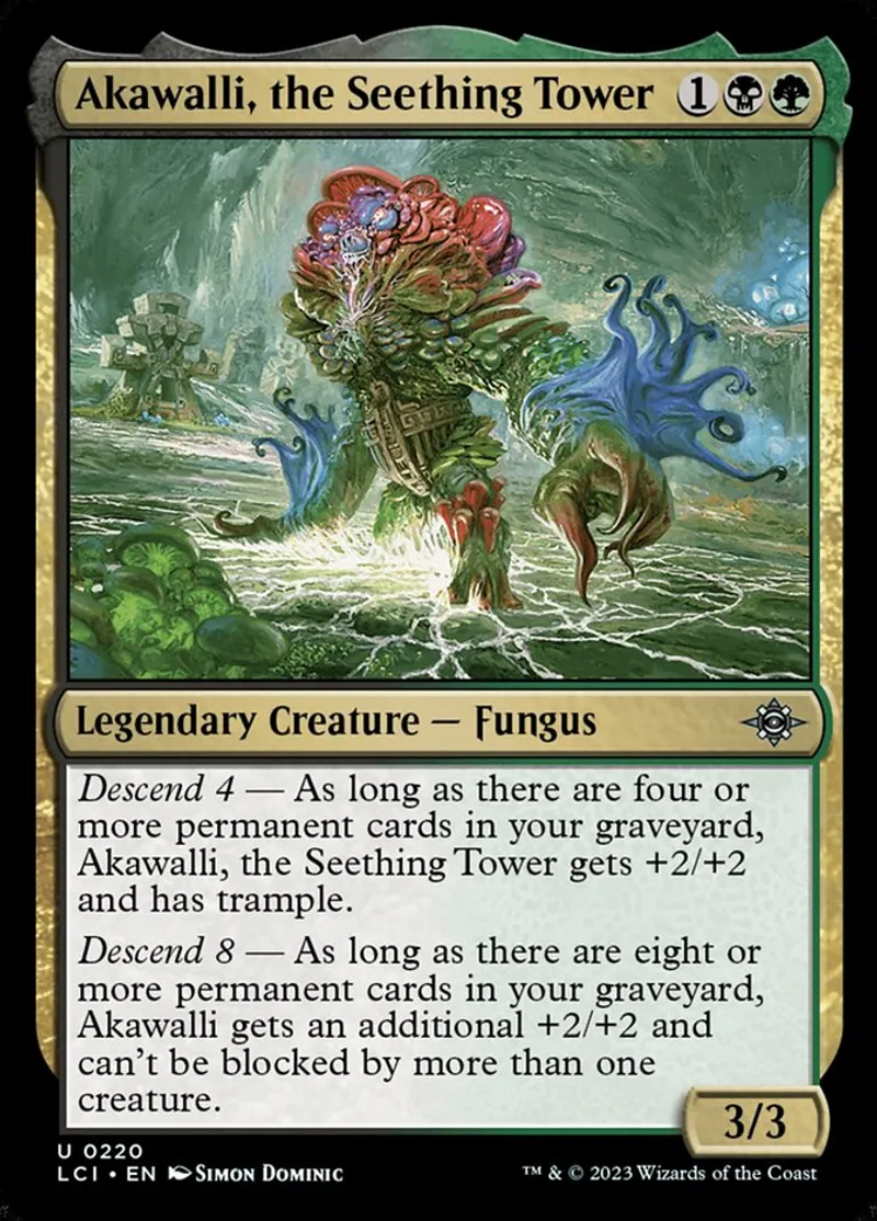 | Oracle Text | Descend 4 — As long as there are four or more permanent cards in your graveyard, Akawalli, the Seething Tower gets +2/+2 and has trample.