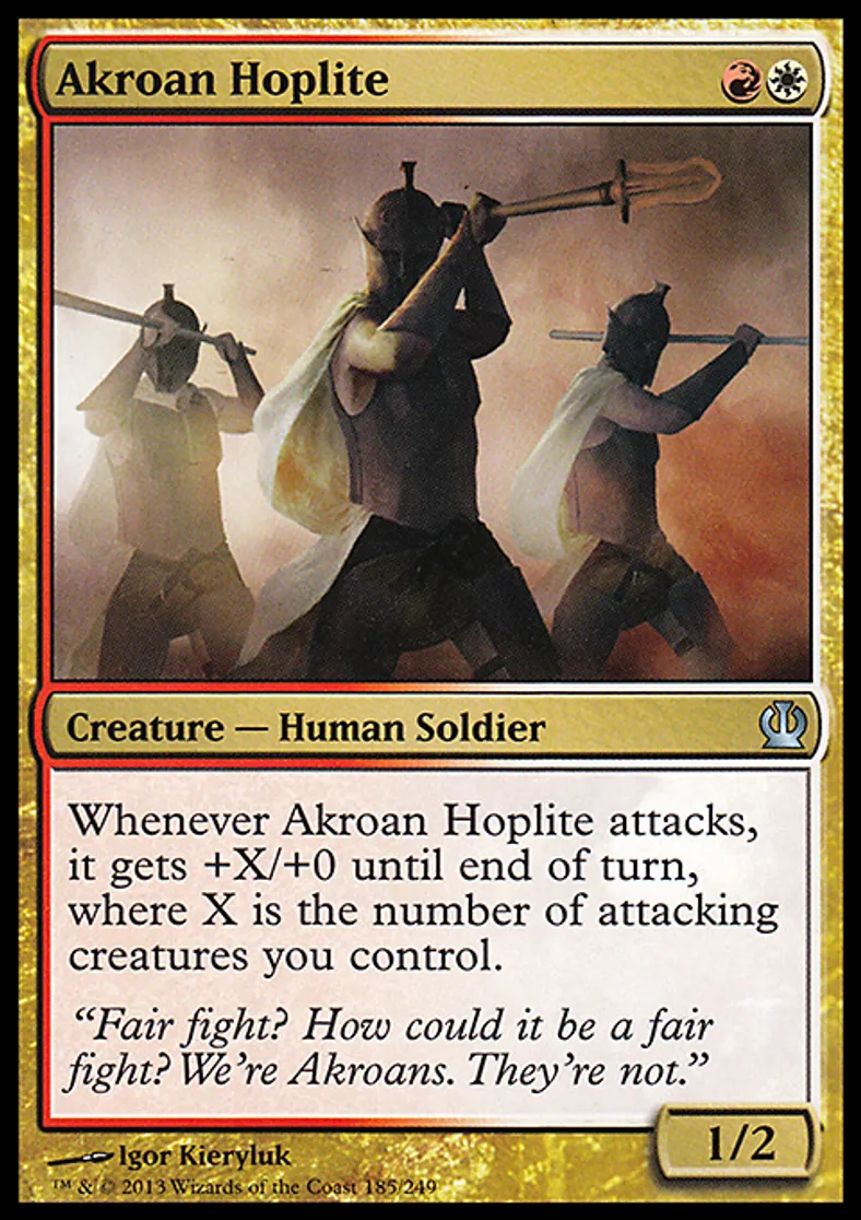 | Oracle Text | Whenever Akroan Hoplite attacks, it gets +X/+0 until end of turn, where X is the number of attacking creatures you control. | ||