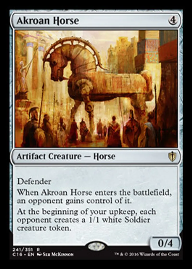 | Oracle Text | Defender When Akroan Horse enters the battlefield, an opponent gains control of it. At the beginning of your upkeep, each opponent creates a 1/1 white Soldier creature token. | ||