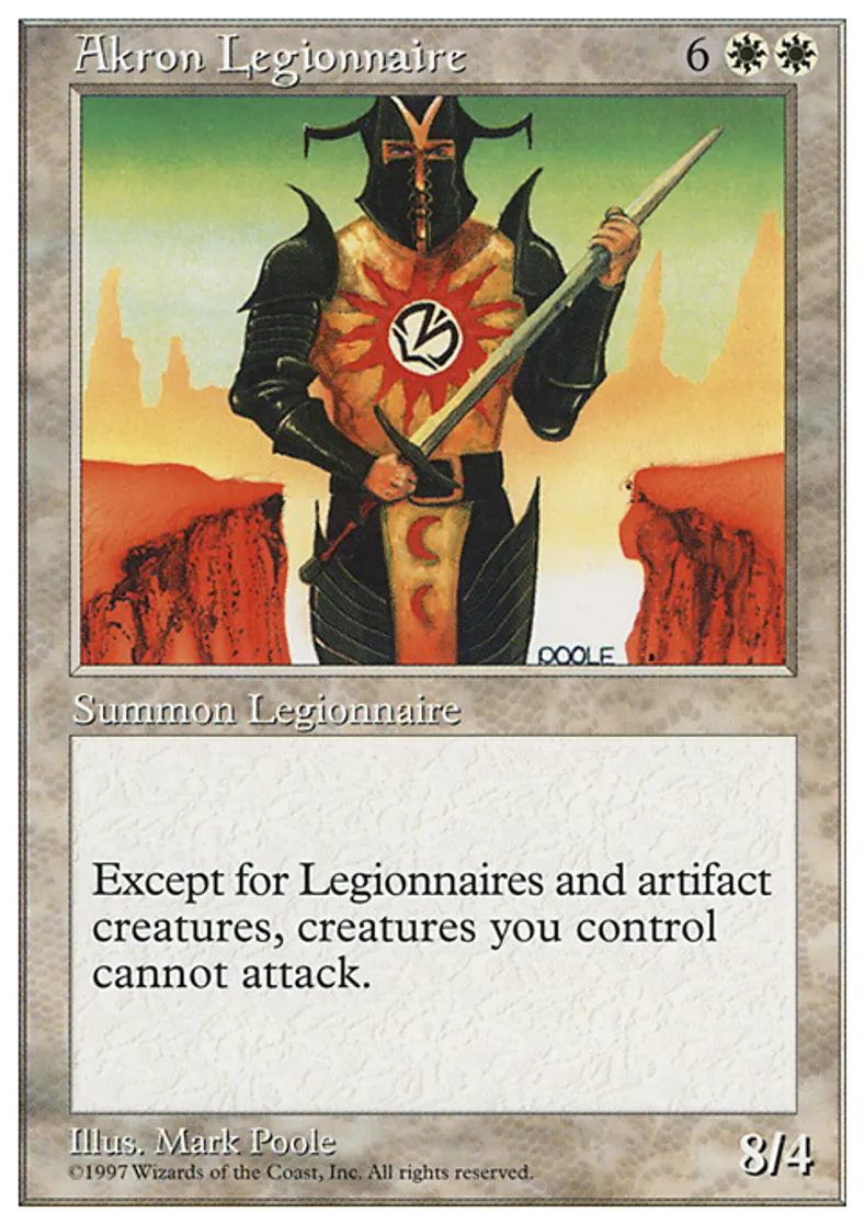 | Oracle Text | Except for creatures named Akron Legionnaire and artifact creatures, creatures you control can't attack. | ||