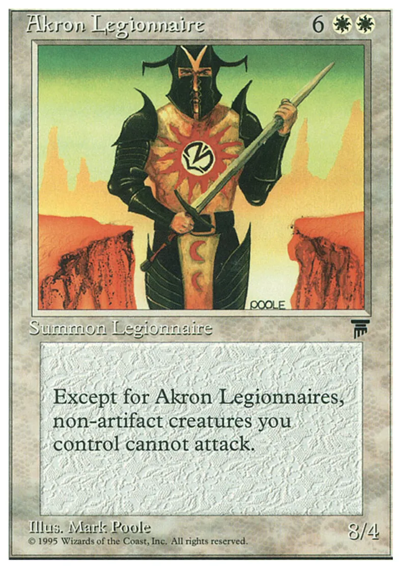 | Oracle Text | Except for creatures named Akron Legionnaire and artifact creatures, creatures you control can't attack. | ||
