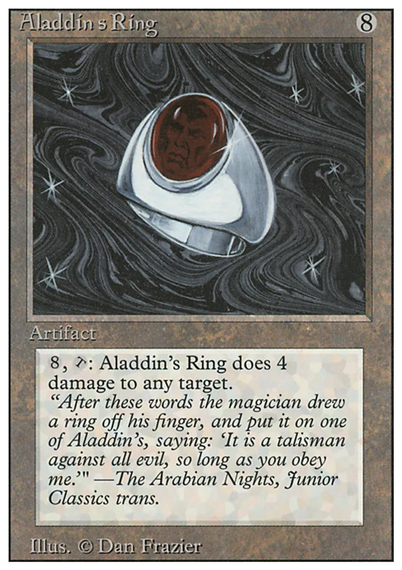 | Oracle Text | {{8}}, {{t}}: Aladdin's Ring deals 4 damage to target creature or player. | ||