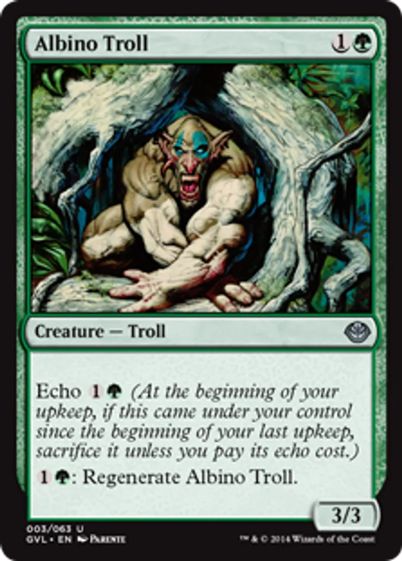 | Oracle Text | Echo {{1}}{{g}} (At the beginning of your upkeep, if this came under your control since the beginning of your last upkeep, sacrifice it unless you pay its echo cost.) {{1}}{{g}}: Regenerate Albino Troll. | ||