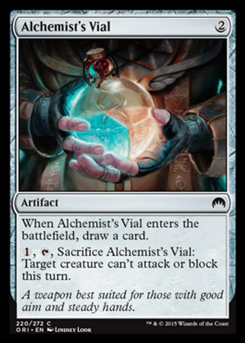 | Oracle Text | When Alchemist's Vial enters the battlefield, draw a card. {{1}}, {{t}}, Sacrifice Alchemist's Vial: Target creature can't attack or block this turn. | ||