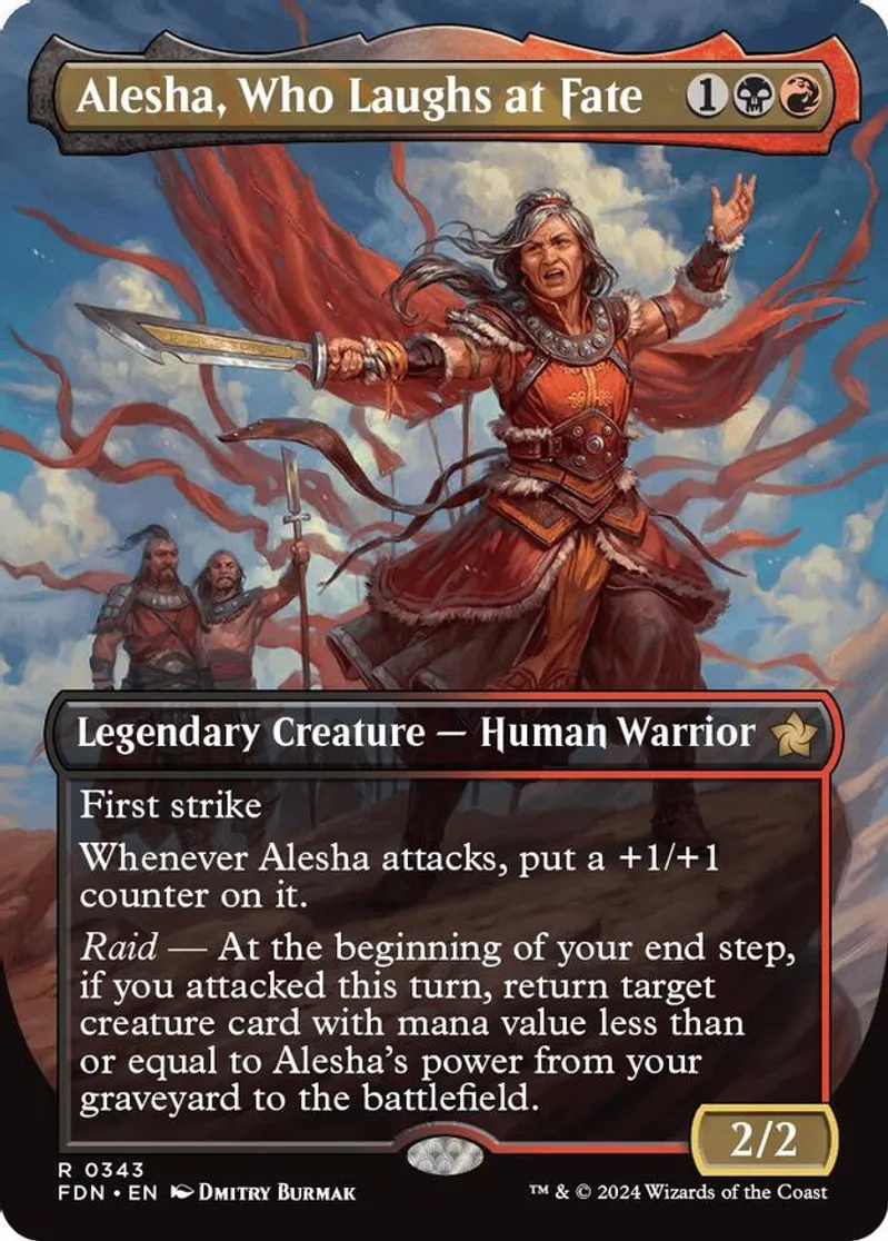 Magic: the Gathering (mtg) Rare legendary creature — human warrior Alesha, Who Laughs at Fate from Foundations (FDN) last updated 2026-02-25 14:50:32