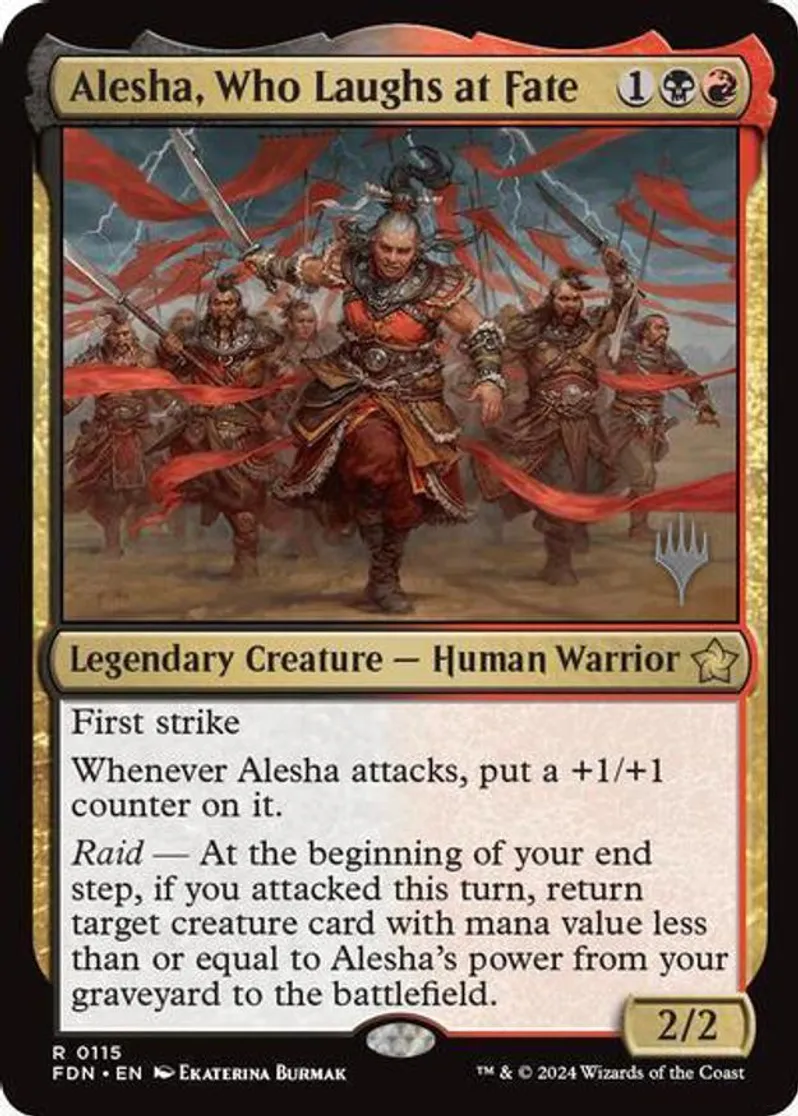 | Oracle Text | first strike whenever alesha attacks, put a +1/+1 counter on it. raid — at the beginning of your end step, if you attacked this turn, return target creature card with mana value less than or equal to alesha's power from your graveyard to the battlefield. | ||