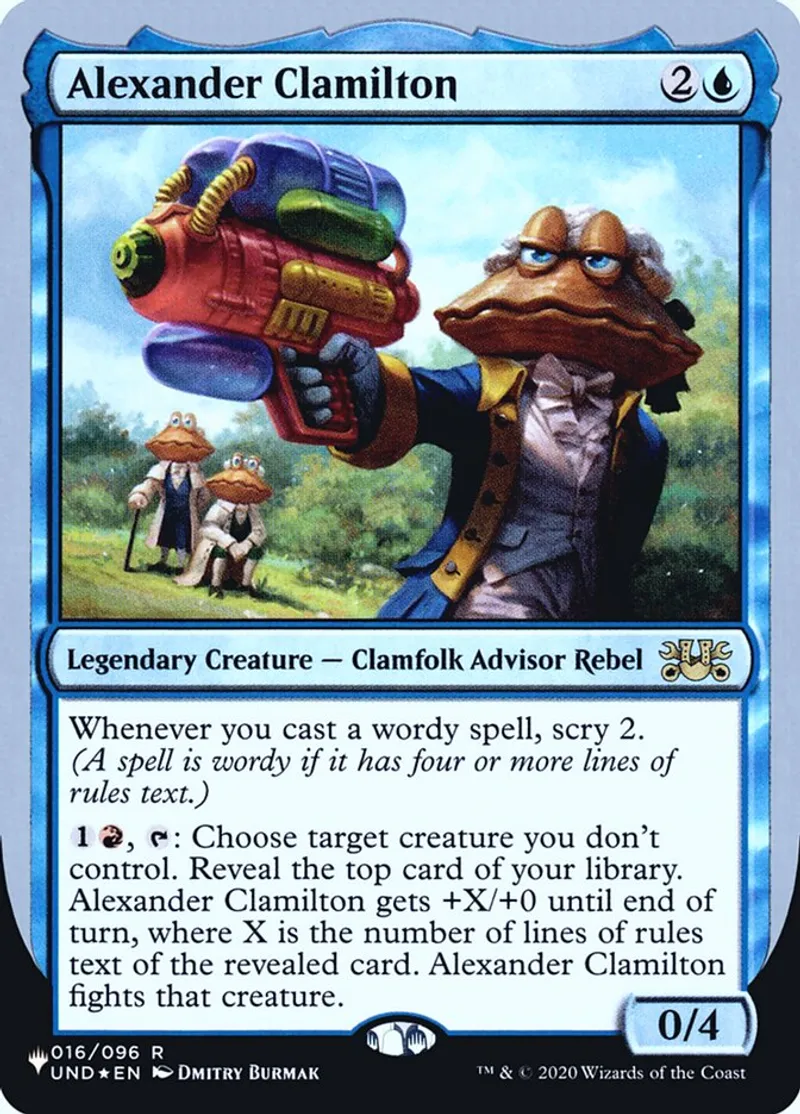 {1}{R}, {T}: Choose target creature you don't control. Reveal the top card of your library. Alexander Clamilton gets +X/+0 until end of turn, where X is the number of lines of rules text of the revealed card. Alexander Clamilton fights that creature. | ||