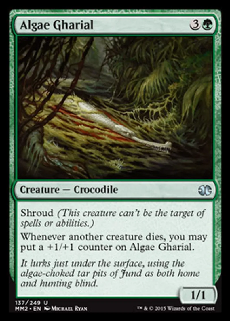 | Oracle Text | Shroud (This creature can't be the target of spells or abilities.) Whenever another creature dies, you may put a +1/+1 counter on Algae Gharial. | ||
