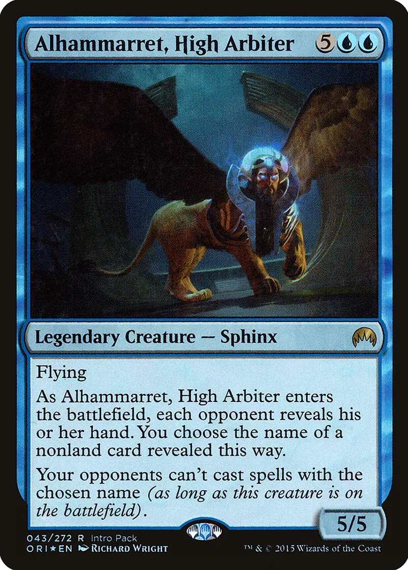 As Alhammarret, High Arbiter enters the battlefield, each opponent reveals their hand. You choose the name of a nonland card revealed this way.