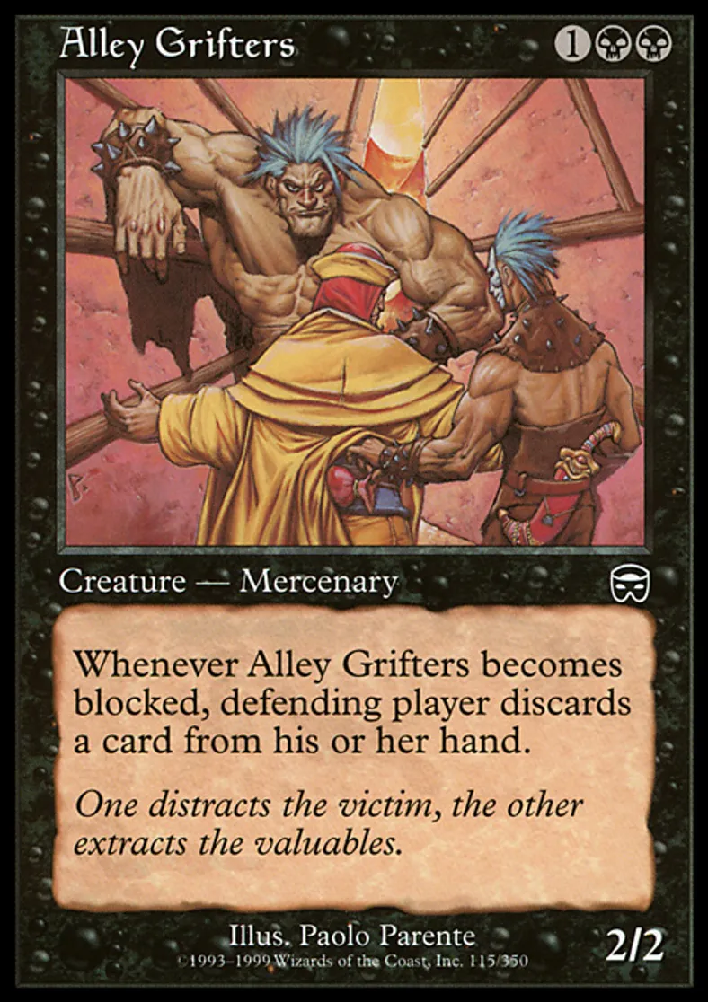 | Oracle Text | Whenever Alley Grifters becomes blocked, defending player discards a card. | ||