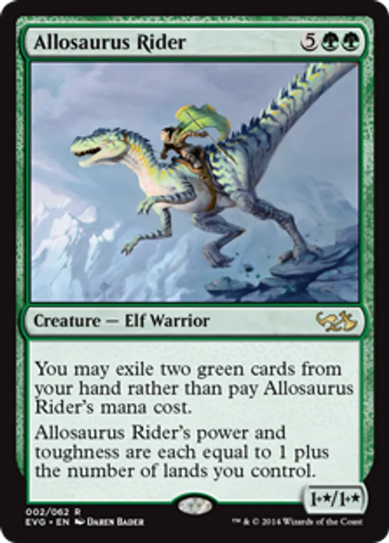 | Oracle Text | You may exile two green cards from your hand rather than pay Allosaurus Rider's mana cost. Allosaurus Rider's power and toughness are each equal to 1 plus the number of lands you control. | ||