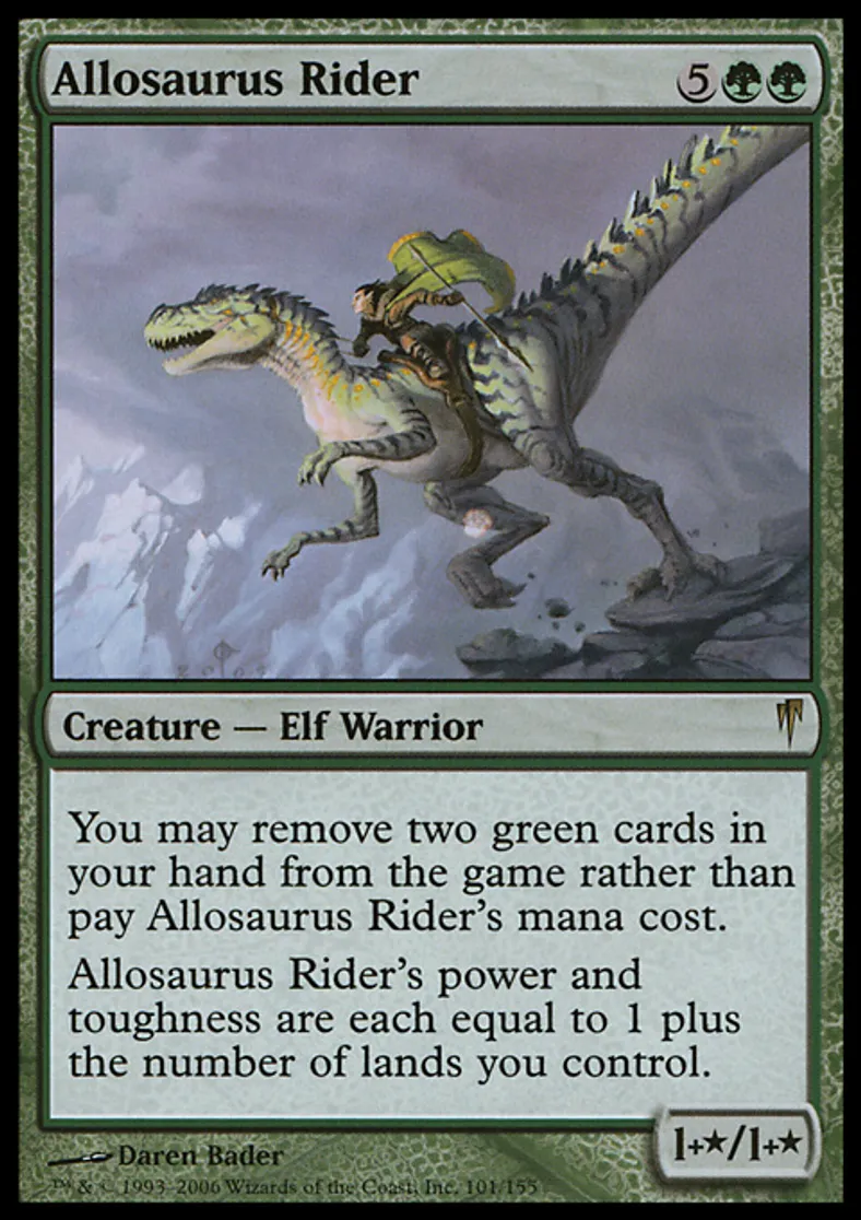 | Oracle Text | You may exile two green cards from your hand rather than pay Allosaurus Rider's mana cost. Allosaurus Rider's power and toughness are each equal to 1 plus the number of lands you control. | ||