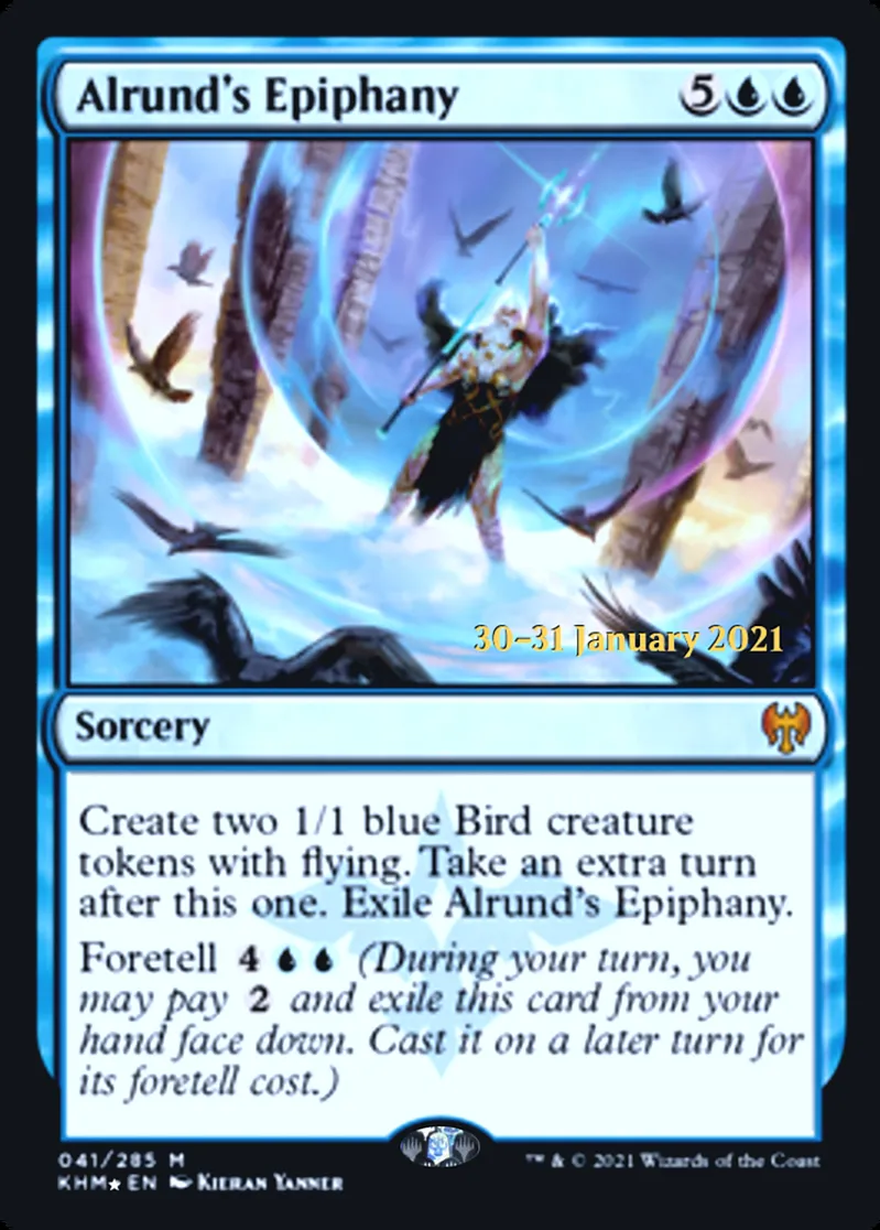 | Oracle Text | Create two 1/1 blue Bird creature tokens with flying. Take an extra turn after this one. Exile Alrund's Epiphany.