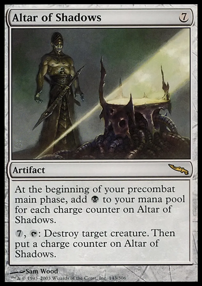 | Oracle Text | At the beginning of your precombat main phase, add {{b}} to your mana pool for each charge counter on Altar of Shadows. {{7}}, {{t}}: Destroy target creature. Then put a charge counter on Altar of Shadows. | ||