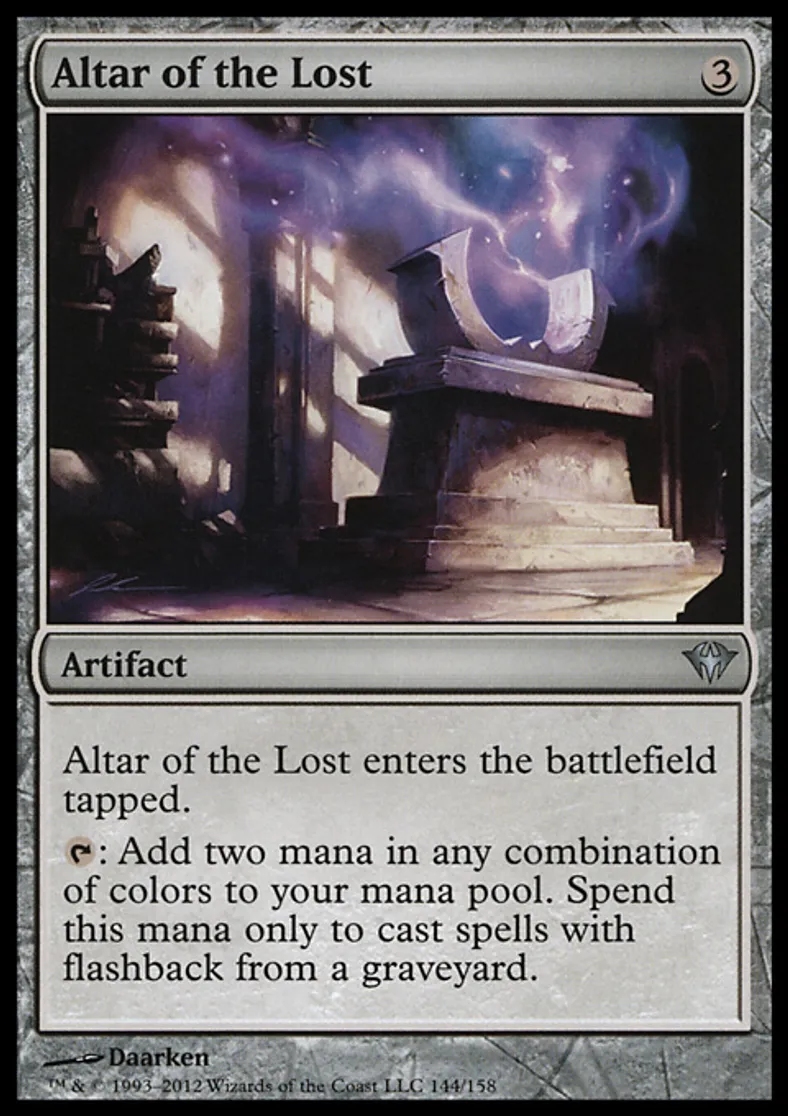 | Oracle Text | Altar of the Lost enters the battlefield tapped. {{t}}: Add two mana in any combination of colors to your mana pool. Spend this mana only to cast spells with flashback from a graveyard. | ||